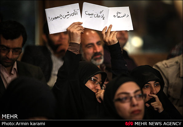 رییس جمهور امروز در دانشگاه تهران حضور یافت.دانشجویانی که توانسته بودند به سالن همایش راه پیدا کنند با پلا کارت های حرف خود را به ایشون نشان دادند.