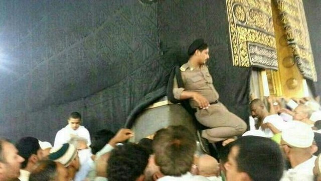 فعالان شبکه اجتماعی تصویری از یکی از ماموران پلیس عربستان در حین انجام وظیفه اش منتشر کردند که او بدون توجه به مقدس بودن خانه کعبه، پای خود را به دیواره آن تکیه داده است.