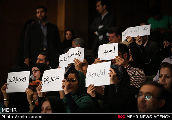 رییس جمهور امروز در دانشگاه تهران حضور یافت.دانشجویانی که توانسته بودند به سالن همایش راه پیدا کنند با پلا کارت های حرف خود را به ایشون نشان دادند.