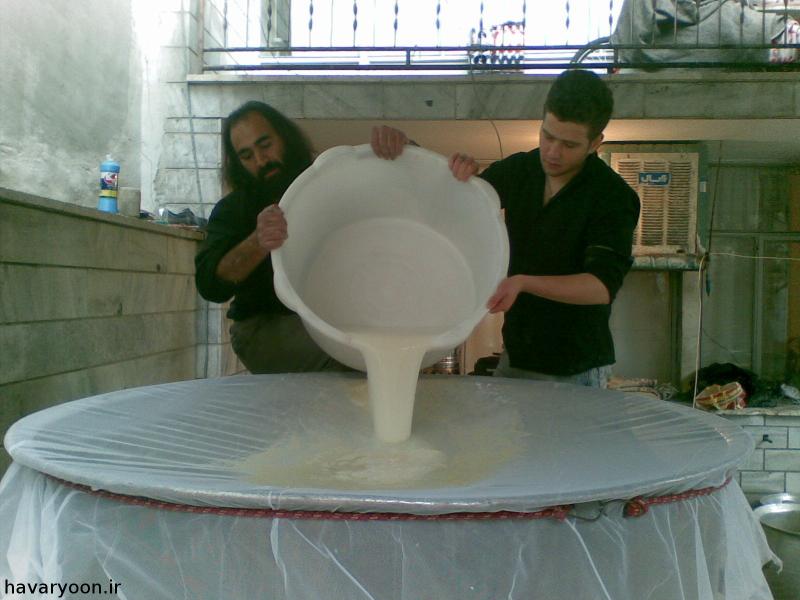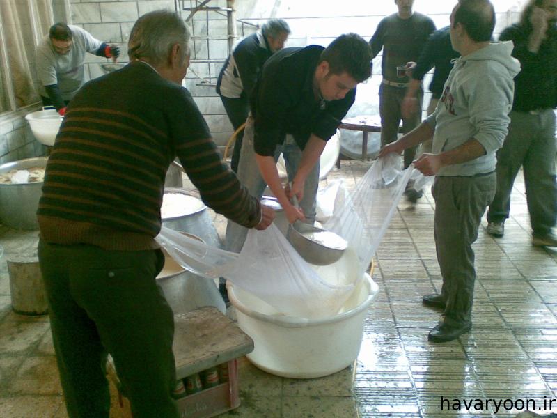همه به هم کمک می کنند و برای راه انداختن بساط سمنو شور و هیجان دارند. روی پاتیل توری می کشند و شیره گندم را داخل آن می ریزند، آرد هم به آن اضافه می کنند وهم می زنند.