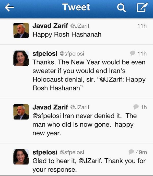 دختری در پای این پیام اظهار داشت: "این عید زیباتر بود اگر شما به رد کردن هولوکاست توسط ایران پایان می دادید". ظریف هم در پاسخ به او نوشت: "ایران هیچ گاه هولوکاست را رد نکرده است. مردی که تصور می شد اینطور فکر می کند حالا رفته است، سال نو مبارک". این پیغام ظریف در نوع خود در جمهوری اسلامی بی سابقه بود.